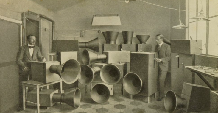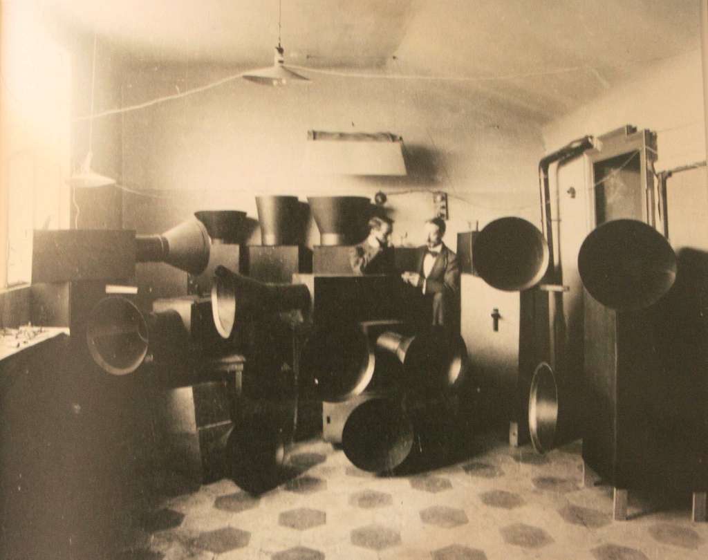 Luigi Russolo et son assistant Ugo Piatti en 1913, dans leur atelier milanais, avec des intonarumori, machines sonores expérimentales à faire des bruits